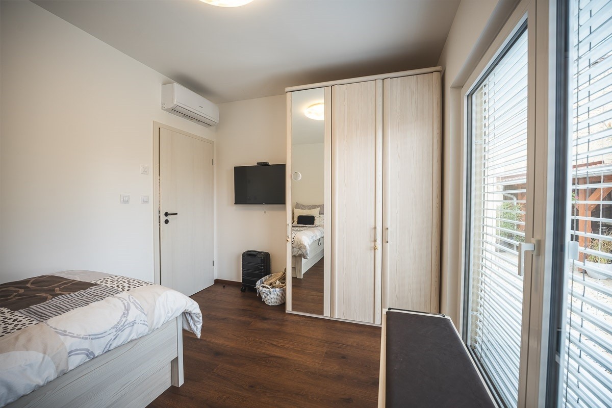 Stejně jako v ostatních místnostech je i v tomto pokoji instalovaná klimatizace