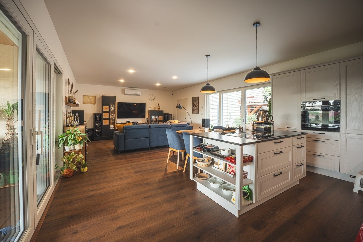 Hlavní obytný prostor propojuje kuchyni, jídelnu i obývací část v jeden velký společný celek