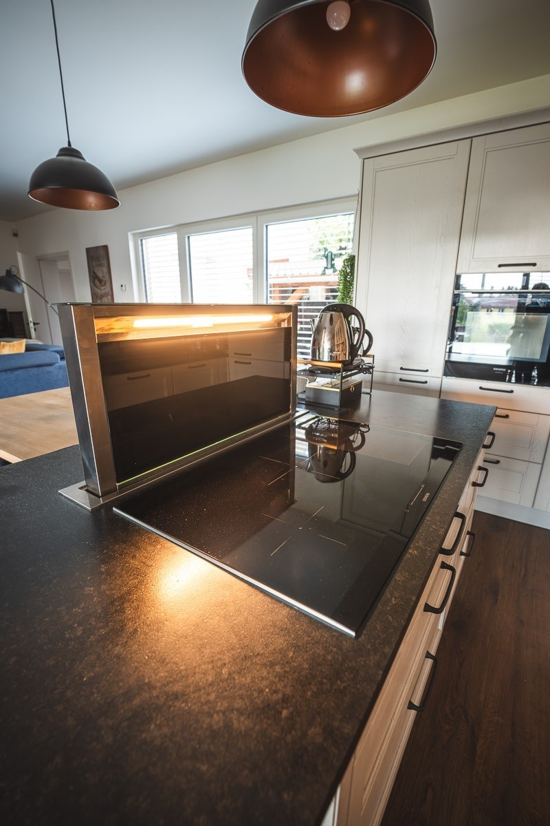 Součástí kuchyňského ostrůvku je varná deska s výsuvnou digestoří, která se vysune jen při vaření a jinak zůstává skrytá v pracovní desce