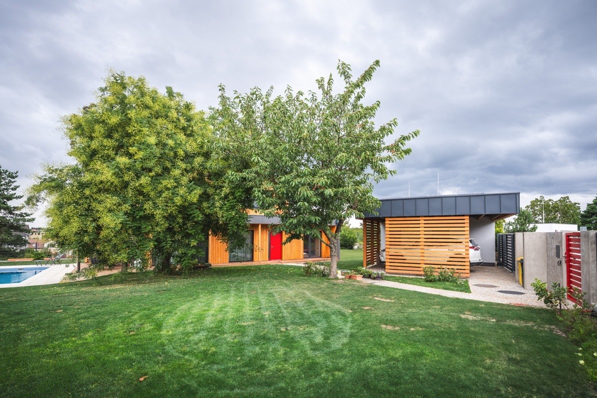 Majitelé mají carport, protože jim garáž přišla zbytečná. Ke konci stavby si sice říkali, že by mohli mít i garáž v podzemí, ale to by znamenalo o několik milionů vyšší investici