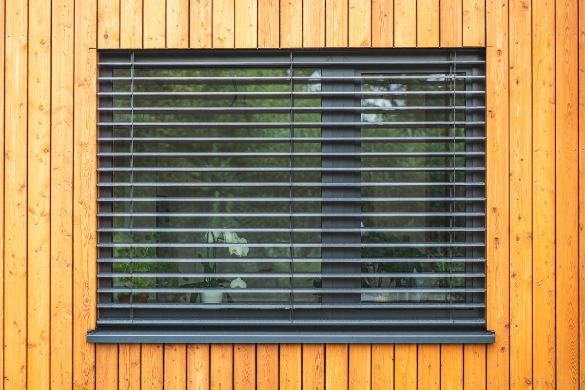 Předokenní žaluzie jsou ze tří stran domu. Na čtvrtou stranu je majitelé nedávali, protože tam jsou jen technické místnosti a koupelny