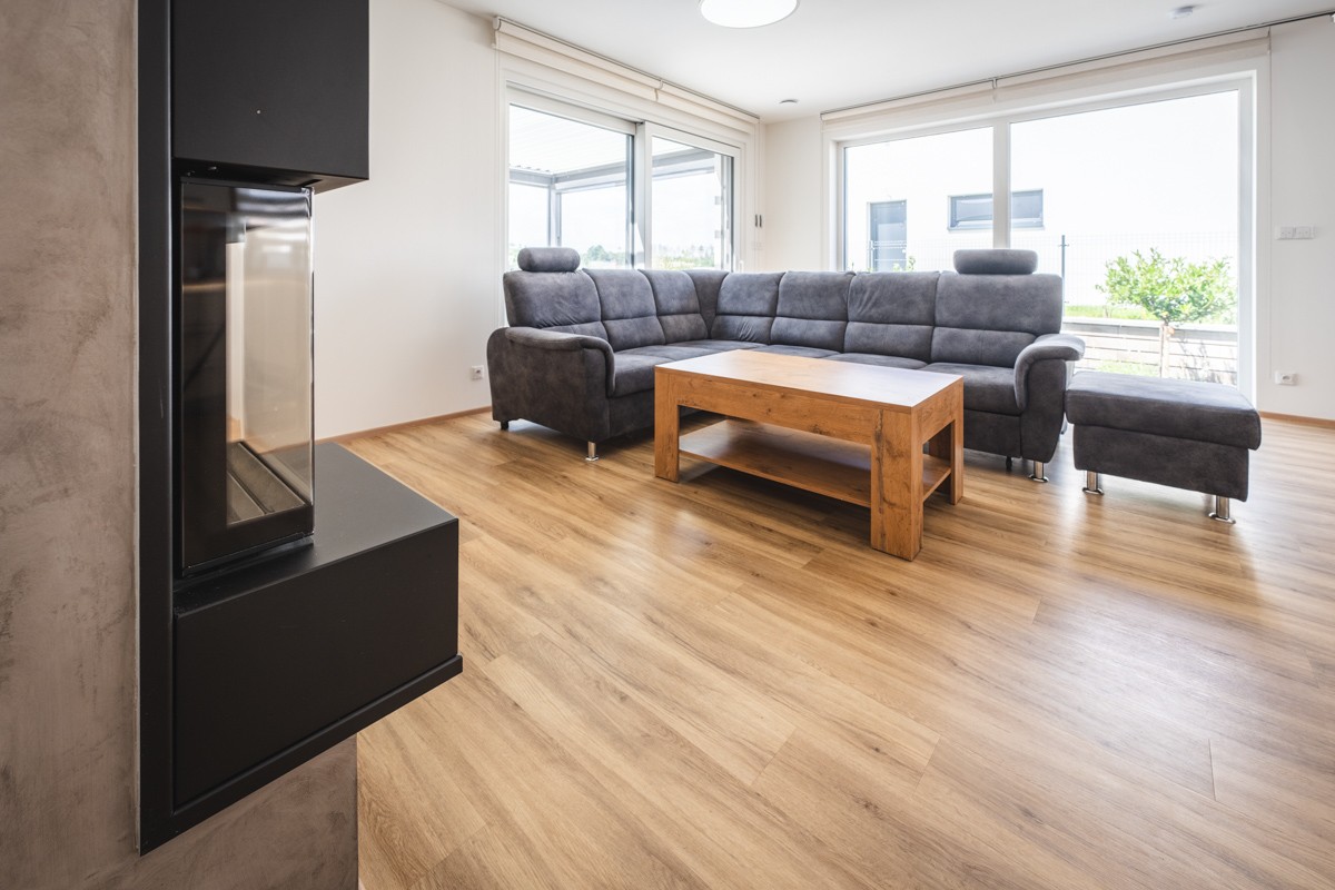 Prostorný obývák je zařízen v elegantním stylu. Díky velkým oknům je krásně prosluněný