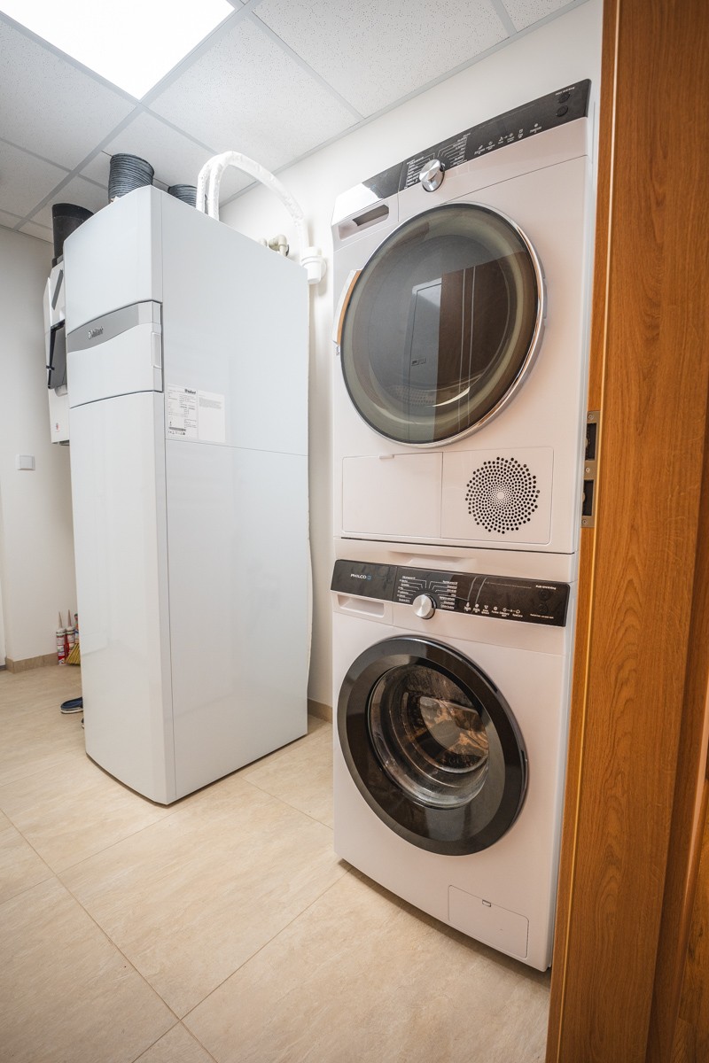 V domě se nachází i technická místnost, ve které najdeme pračku se sušičkou, vnitřní jednotku tepelného čerpadla a rekuperaci