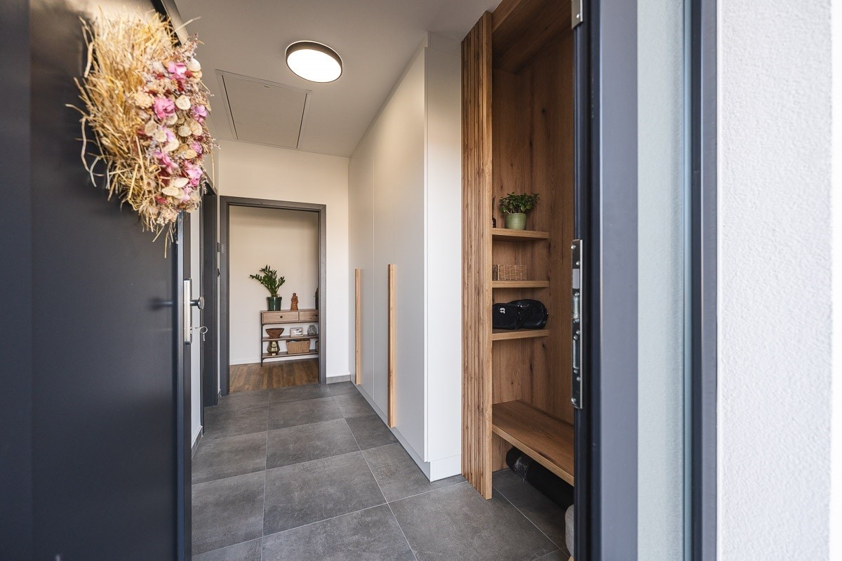 Za velkou vstupní chodbu je majitelka velmi ráda a všem budoucím stavitelům ji vřele doporučuje. Celá pětičlenná rodina tu má prostor na obutí botou