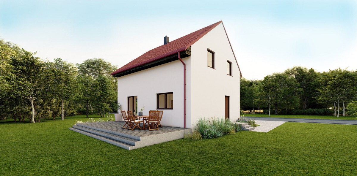 Vizualizace kompaktního rodinného domu ukazuje jednoduchou moderní architekturu s prostornou terasou orientovanou do zahrady