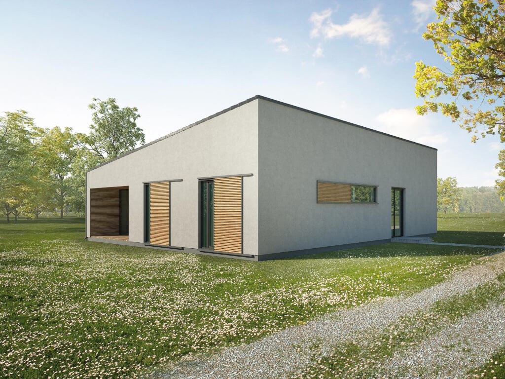 Rodinný dům nemusí být nutně obložený dřevem. Zde vidíte vizualizaci domu s omítkou