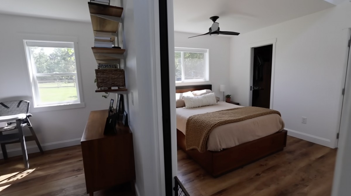 Ložnice nabízí manželskou postel, stropní ventilátor, vestavěnou šatnu a dvě okna s výhledem do zahrady