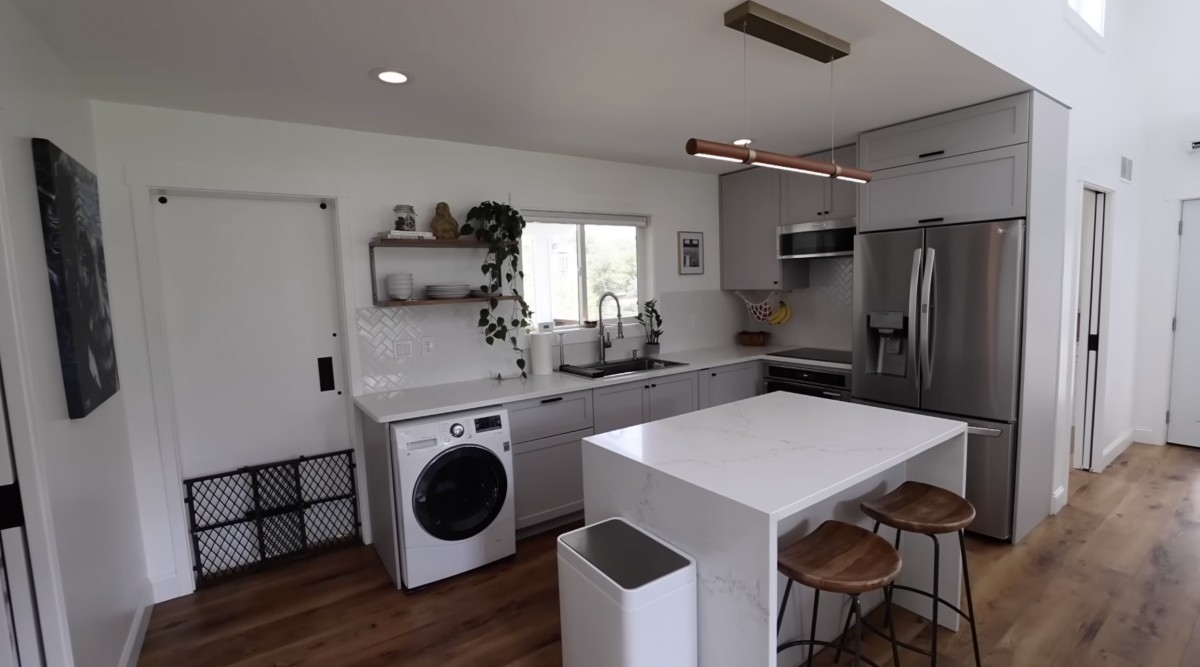 Moderní kuchyň je vybavena ostrůvkem, vestavěnými spotřebiči, pračkou a úložnými skříňkami podél celé stěny