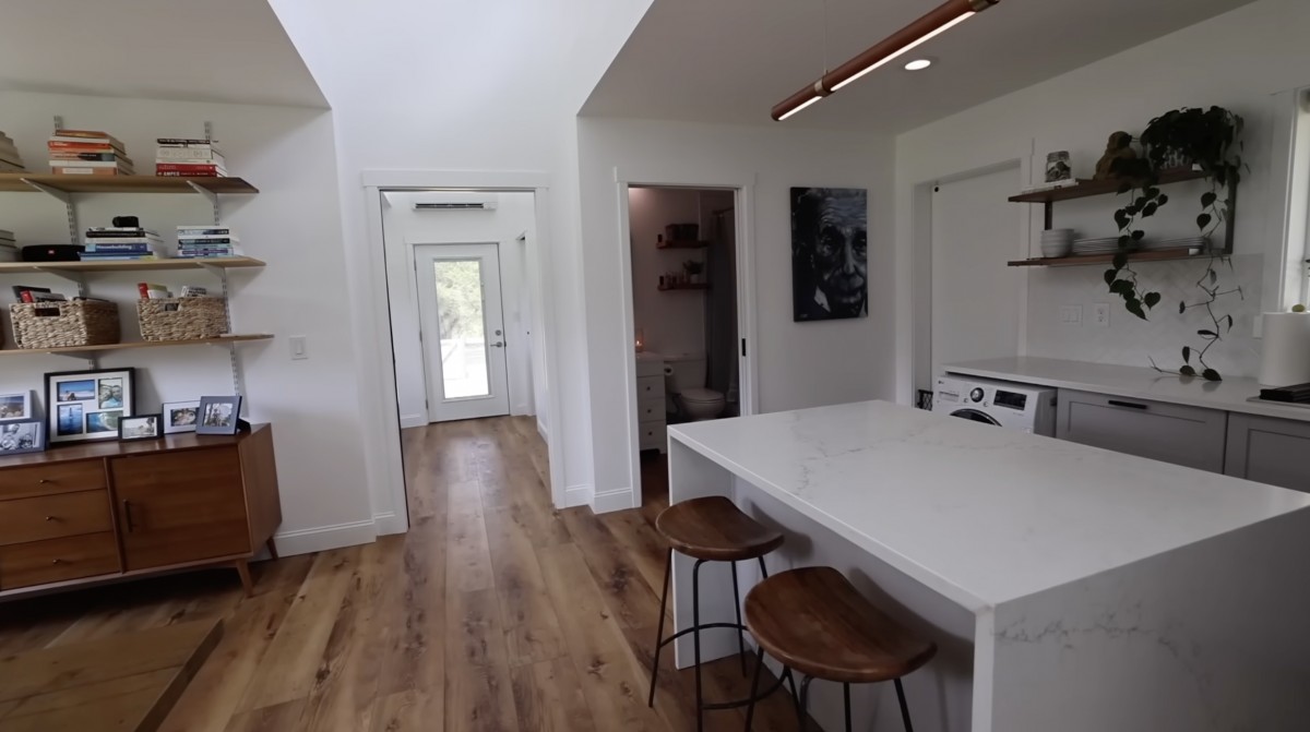 Kuchyň s ostrůvkem a otevřenými policemi navazuje na chodbu, z níž je vstup do koupelny a na zadní dveře domu