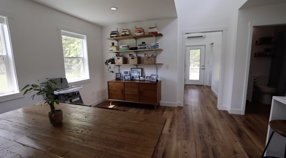 Obytný prostor propojuje jídelní část s úložnou komodou a otevřenými policemi, odkud vede chodba k zadnímu vstupu