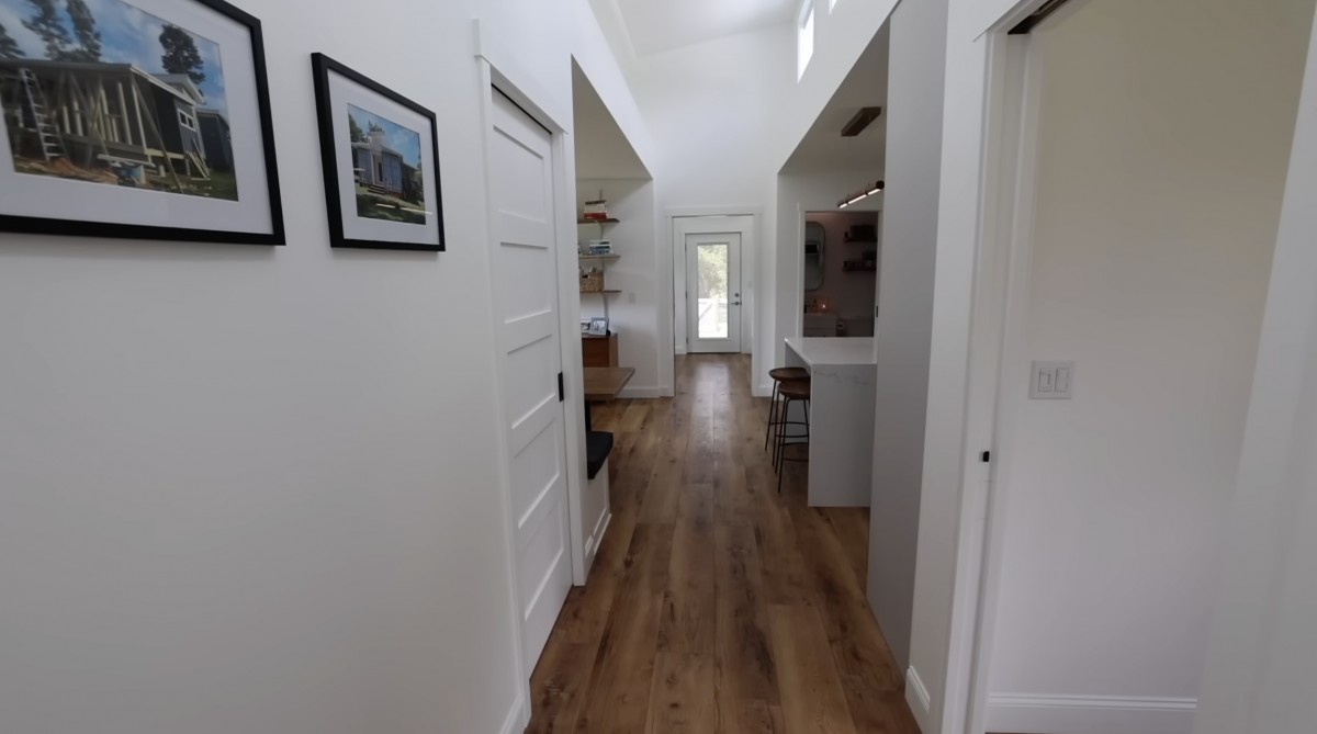 Z chodby vede vstup do obytné části s kuchyňským koutem, otevřeným úložným prostorem a koupelnou v zadní části domu
