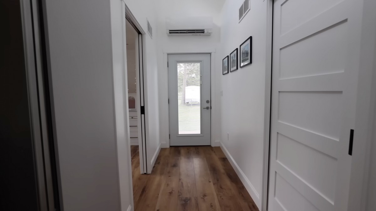 Interiér domu tvoří světlá chodba s dřevěnou podlahou, posuvnými dveřmi a klimatizační jednotkou nad vstupem