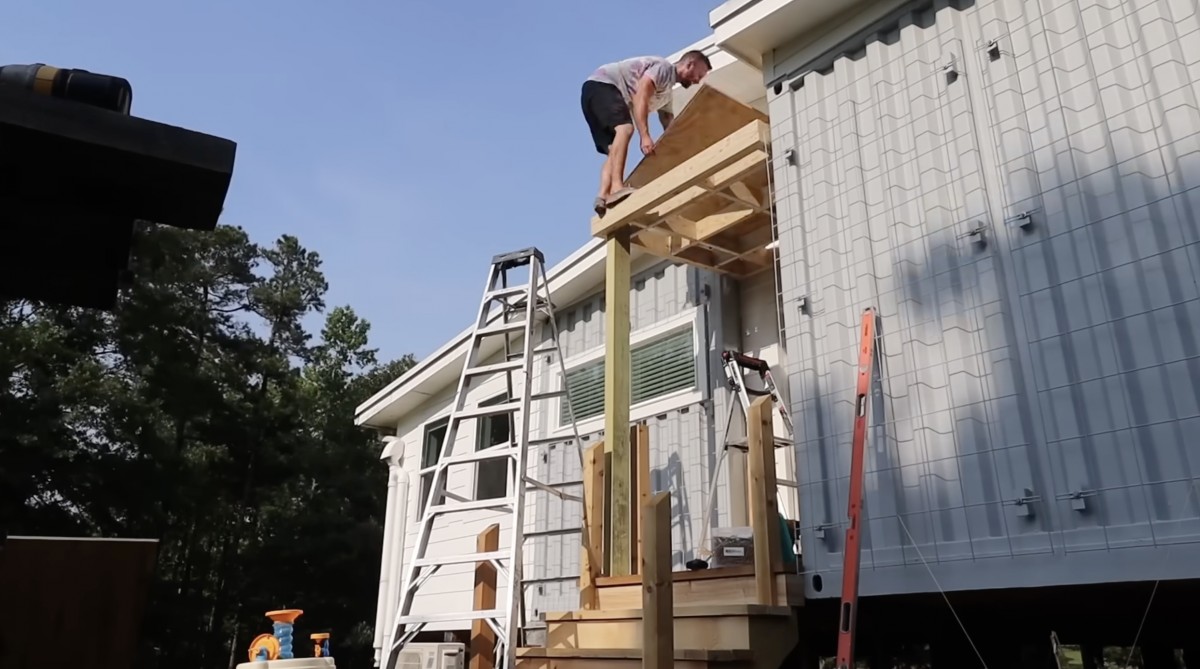 Nad vstupními schody budují dřevěné zastřešení, které ochrání vchod do kontejnerového domu před deštěm