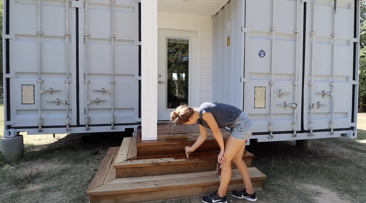 Před vstupem do domu z kontejnerů natírá dřevěné schody, které vedou k hlavním dveřím