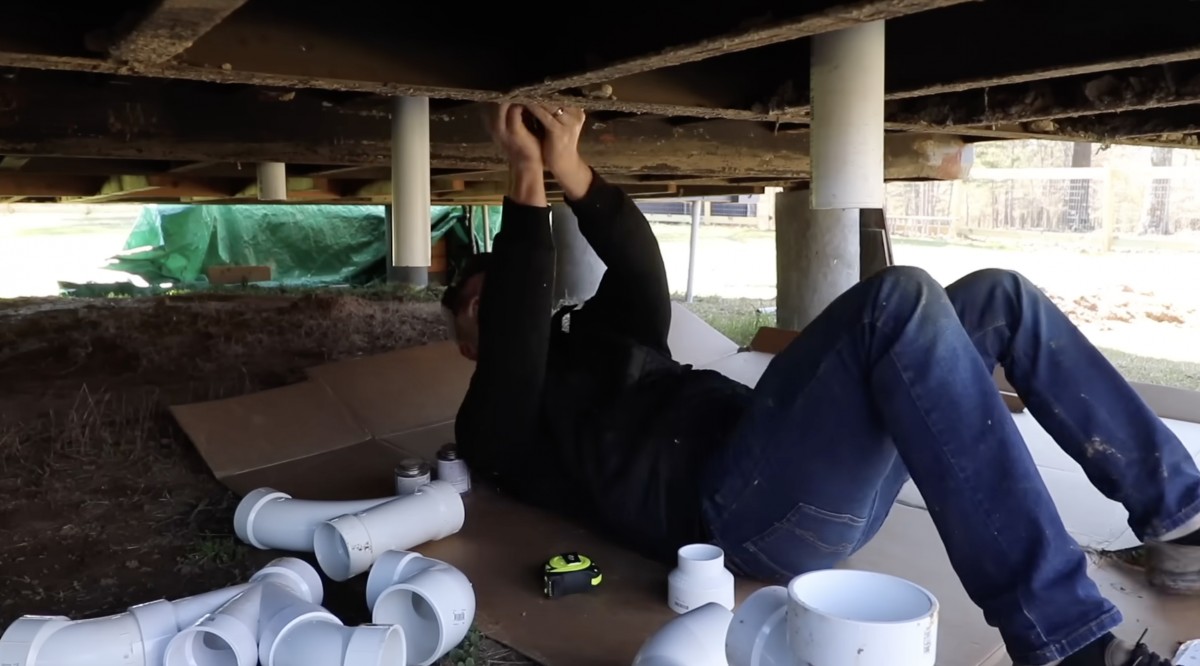 Pod kontejnerem instaluje rozvody vody a odpadního potrubí, které zajišťují základní infrastrukturu domu