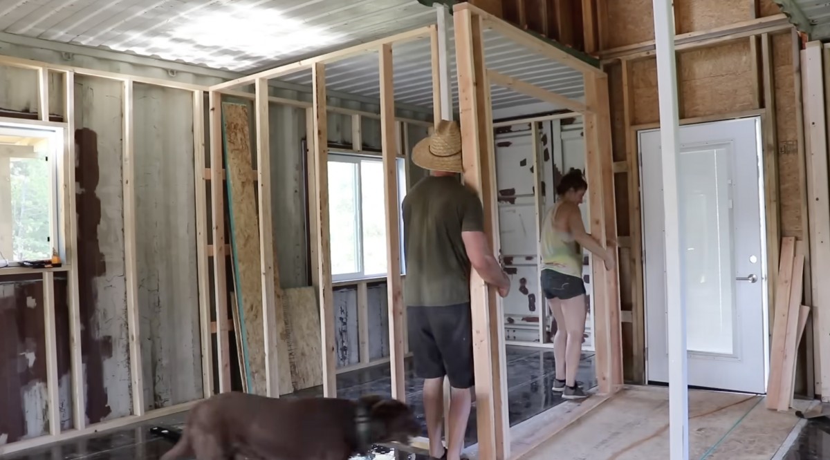 Uvnitř kontejneru budují dřevěné příčky, které vymezují jednotlivé místnosti budoucího domu