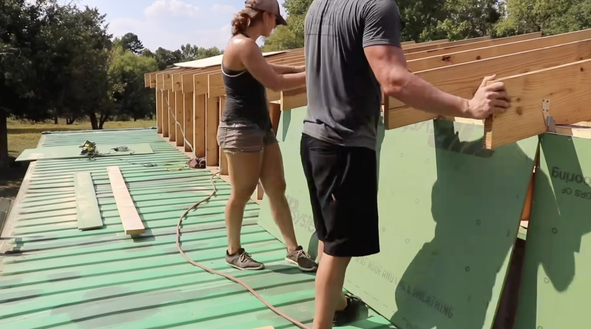 Pár na střeše kontejneru montuje dřevěný rám a izolační desky pro budoucí nástavbu domu