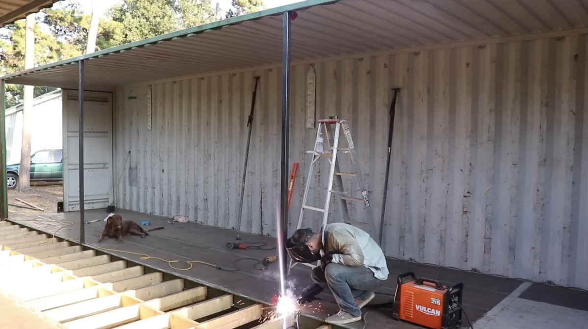 Během úprav kontejneru probíhá svařování ocelových prvků na terase, která rozšiřuje obytný prostor budoucího domu