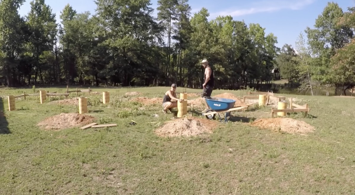 Pár na pozemku připravuje betonové patky pro usazení kontejnerů, které budou tvořit konstrukci jejich budoucího domu