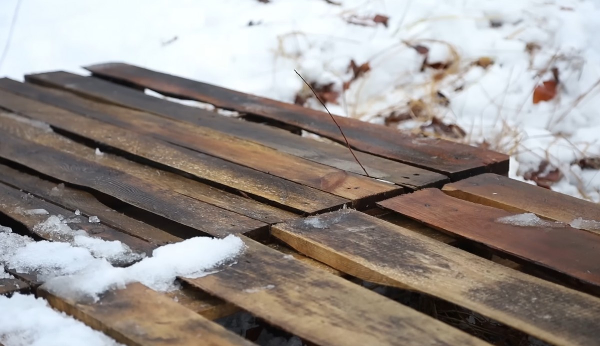 Detail ukazuje nerovná, různě široká prkna z palet, která do sebe musí ručně napasovat. Nic tu není přesné z výroby – všechno vzniká přizpůsobováním kus po kuse
