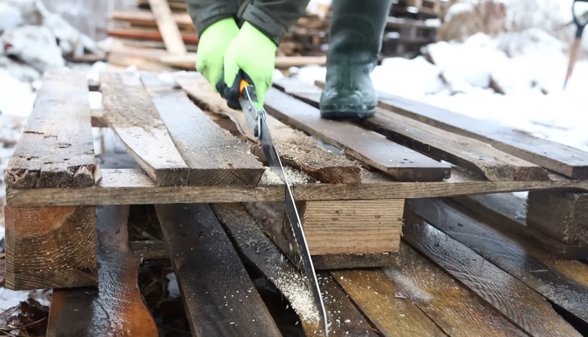 Klekne si do sněhu a ruční pilou upravuje každé prkno tak, aby přesně zapadlo. Bez elektřiny a bez pomoci si všechno řeže a přizpůsobuje sám