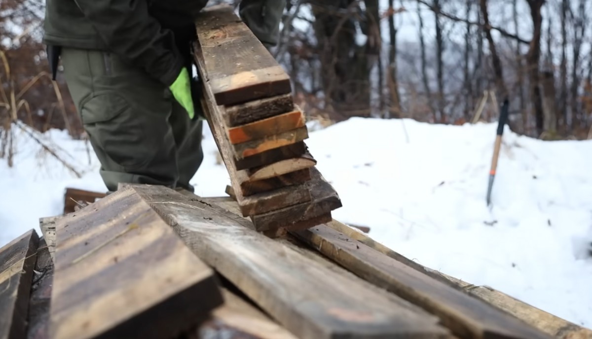 Přinese další prkna a jednoduše je přihodí na hromadu k ostatním. Postupně si připravuje materiál, aby mohl pokračovat dál