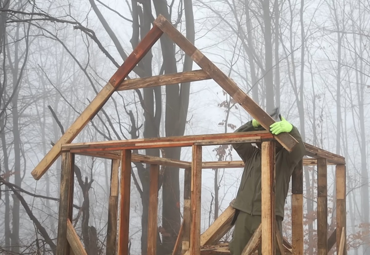 Zvedl a usadil první šikmé trámy střechy, které vytvořily základ jejího tvaru