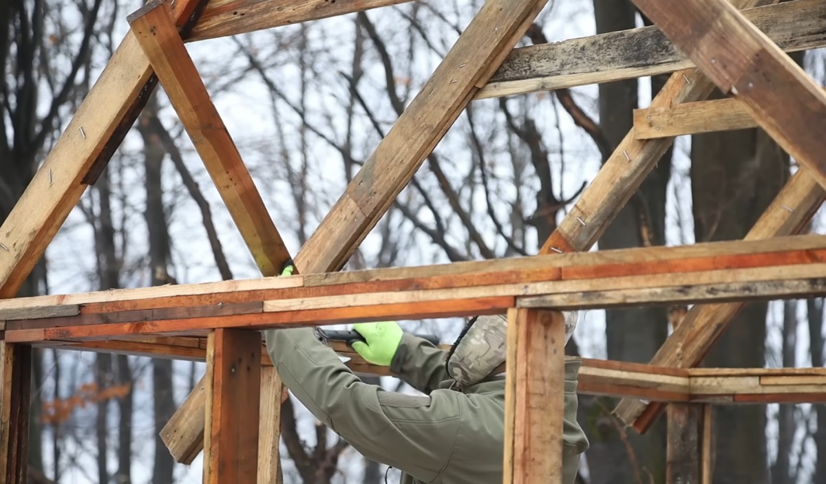 Pod krokvemi přidával další výztuhy a spojoval je s horním rámem, aby se konstrukce nehýbala. Střecha už měla pevný základ a držela pohromadě