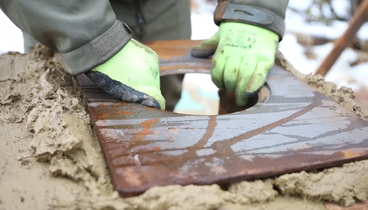 Do horní části kamen usadil kovovou plotnu s otvorem pro kouřovod. Adam ji zatlačil do vrstvy malty, aby dobře seděla