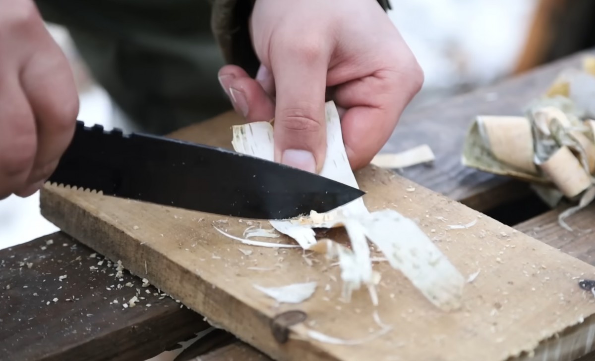 Adam nožem řeže tenké třísky z kusu dřeva. Připravuje si podpal, aby mohl rozdělat oheň a kamna poprvé vyzkoušet