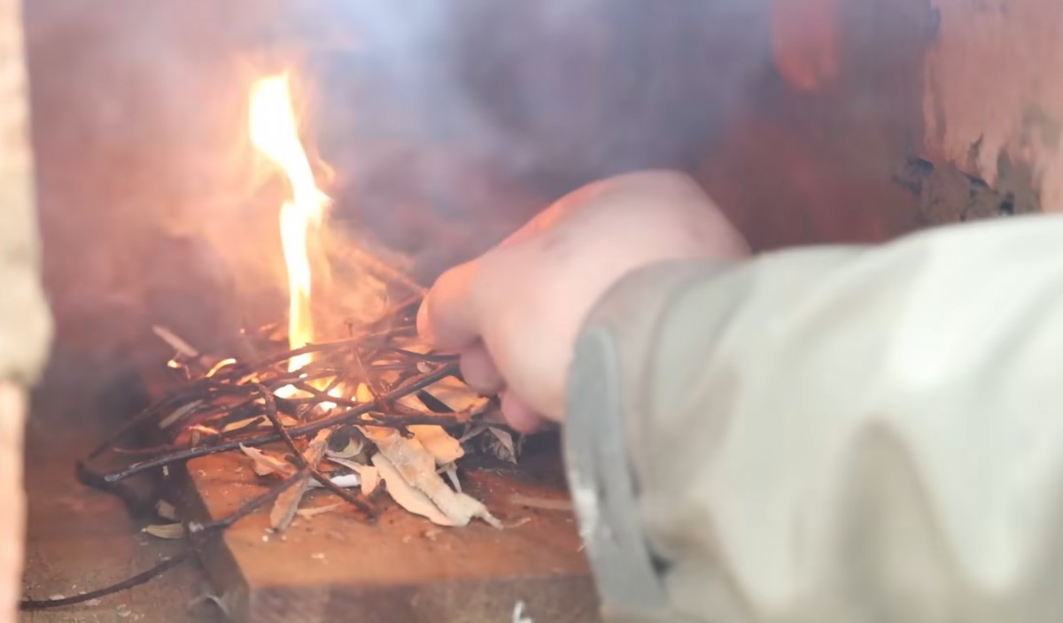 Adam vkládá hořící podpal do topeniště a přidává drobné větvičky. Plamen se chytá a oheň se uvnitř kamen postupně rozhořívá