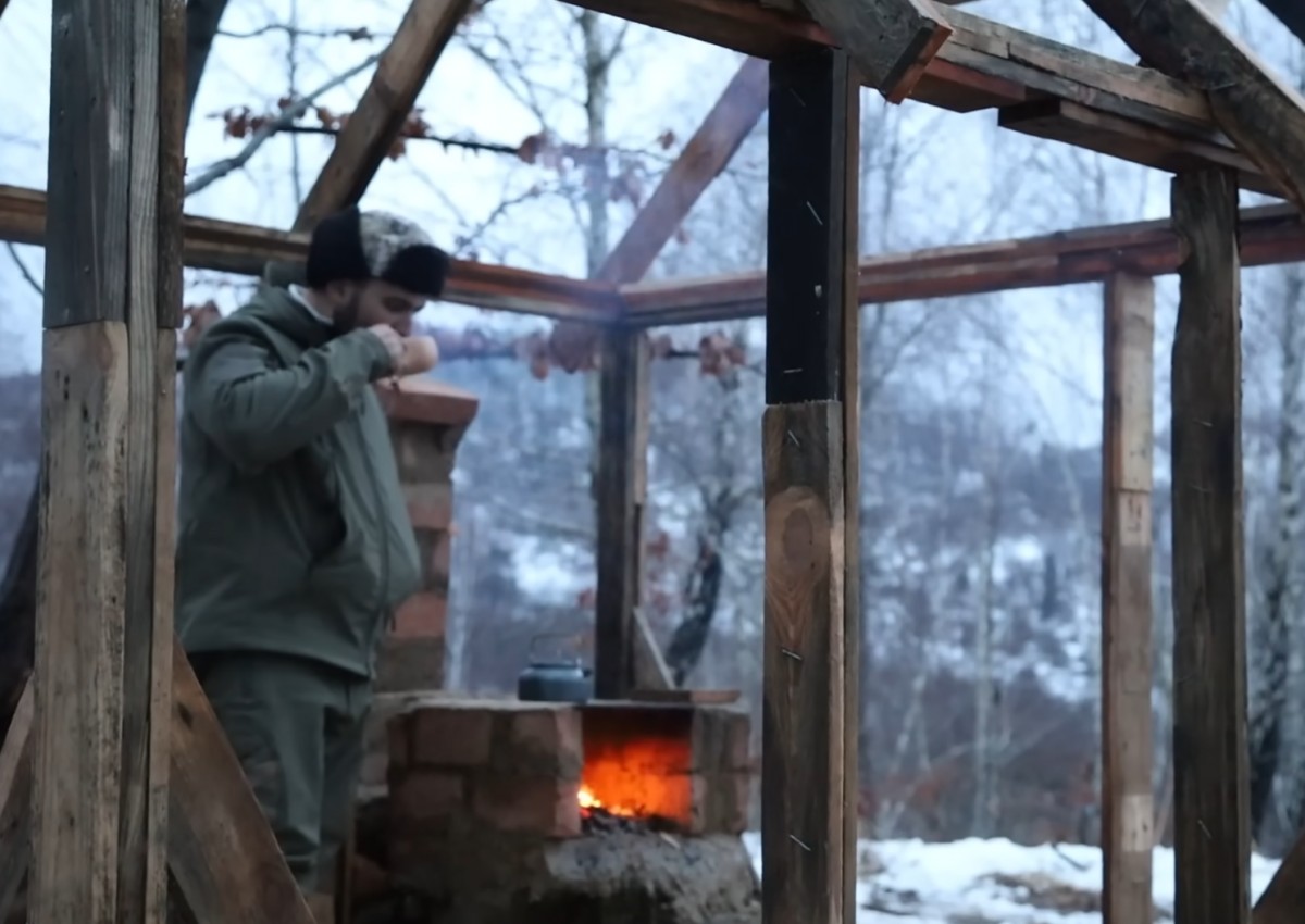 Adam stojí uvnitř dřevěné konstrukce a pije z dřevěného hrnku. Vedle něj hoří oheň v nově postavených cihlových kamnech, které zahřívají otevřený přístřešek uprostřed zimní krajiny