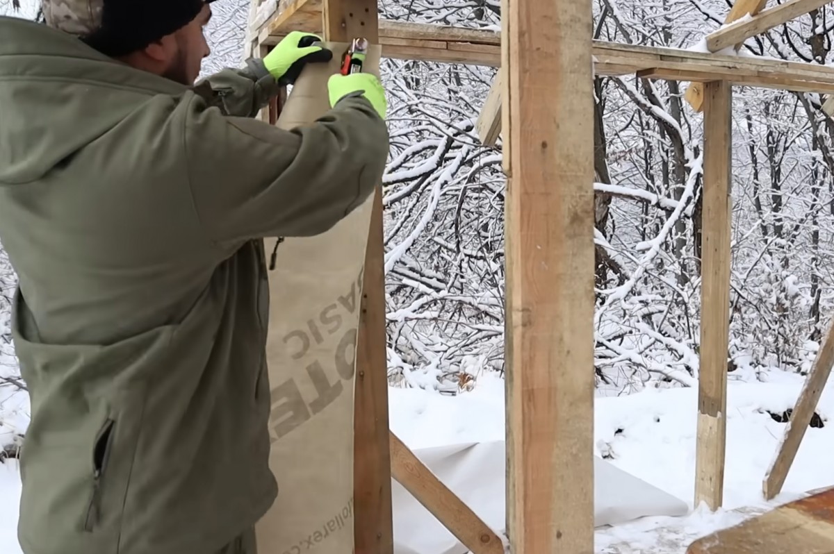 Pak začal fólii skutečně přichytávat ke sloupkům konstrukce. Sponu po sponě ji napínal, aby stěna držela pevně a vítr ji neutrhl