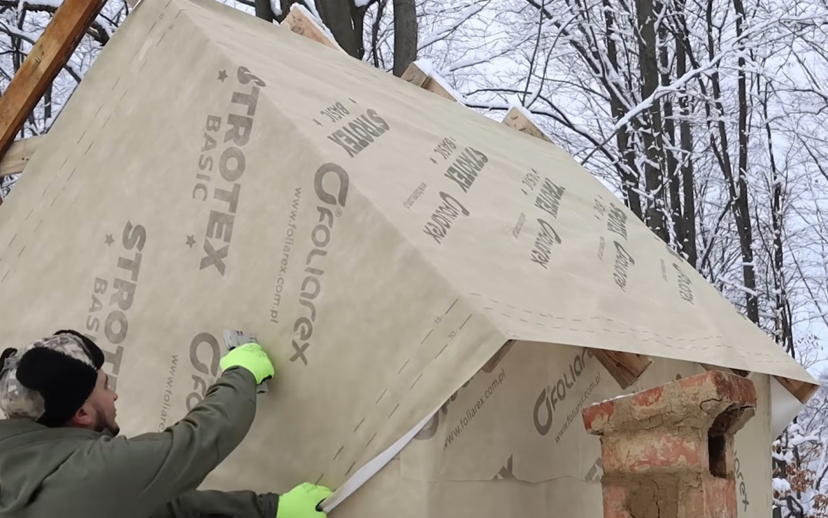 Nakonec natáhl fólii i přes střechu a postupně ji připevňoval k trámům. Přístřešek tím získal první skutečnou ochranu před sněhem a větrem