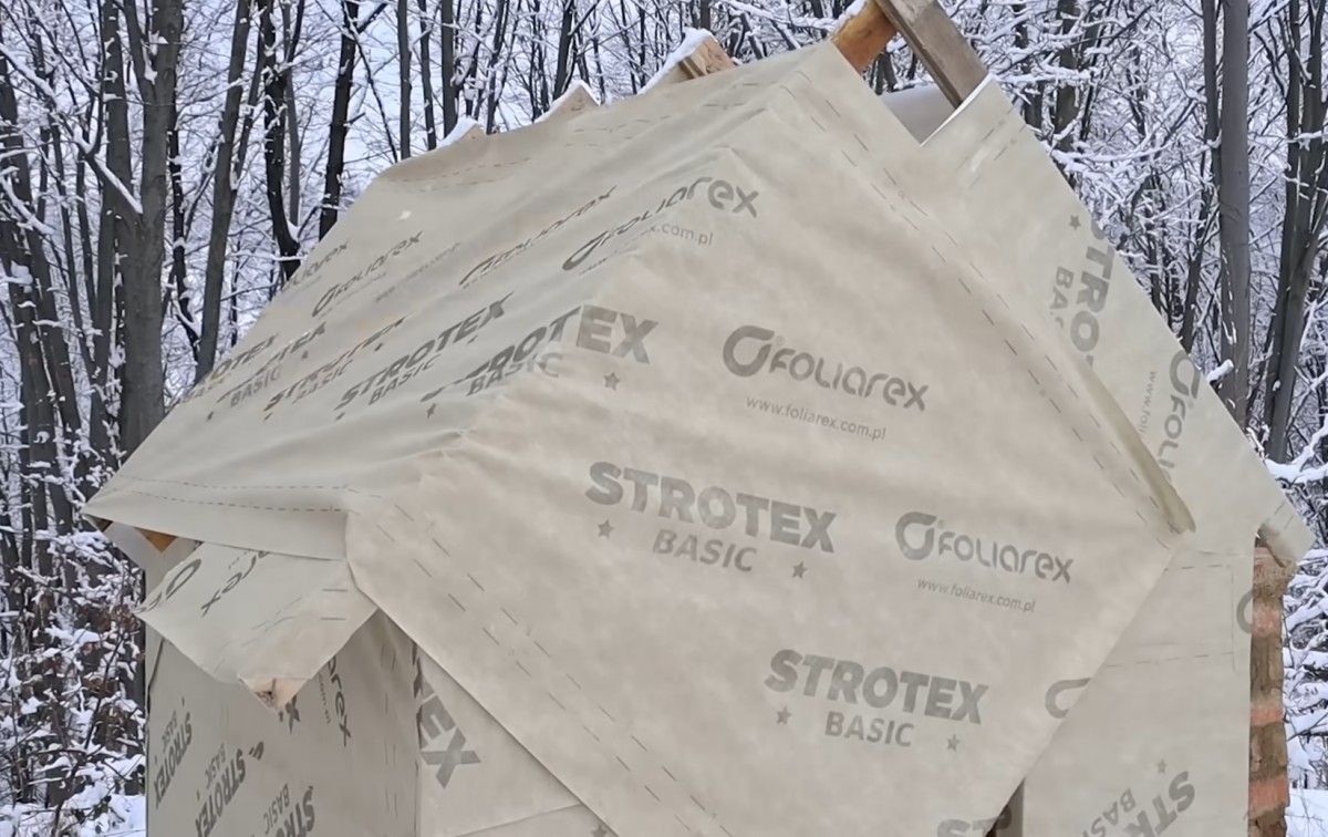 Střechu postupně překryl dalšími pásy fólie, které nechal lehce přes sebe