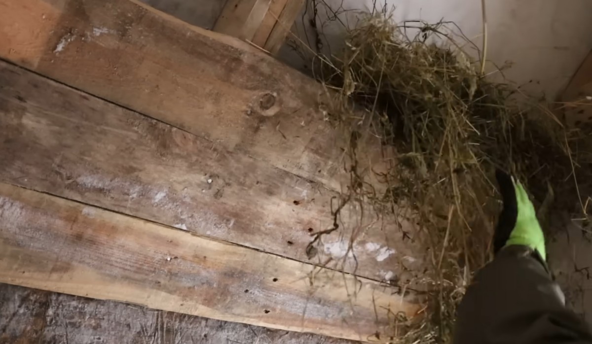 Do horní mezery natlačil další hrst slámy, aby vyplnil poslední netěsnosti