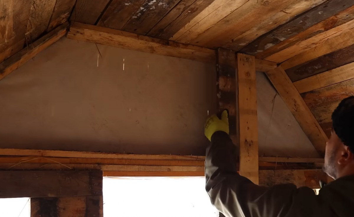 U horní části stěny Adam přidržel svislé prkno a usazoval ho mezi trámy konstrukce. Kontroloval, aby přesně lícovalo s rámem pod střechou