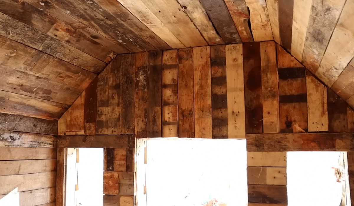 Horní část stěny už byla kompletně obložená svislými prkny z palet. Pod střechou tak vznikla uzavřená dřevěná plocha nad okny