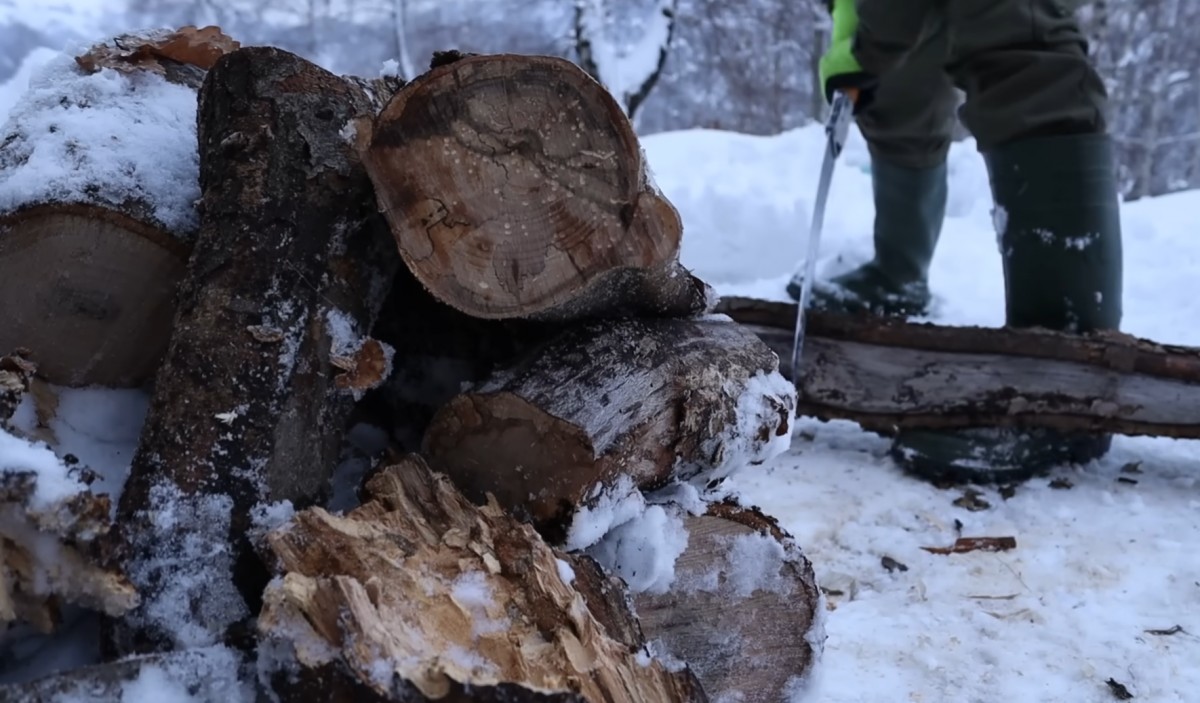 U hromady polen začal štípat a krátit dřevo na menší kusy. Připravoval si zásobu paliva, aby mohl v kamnech pořádně zatopit