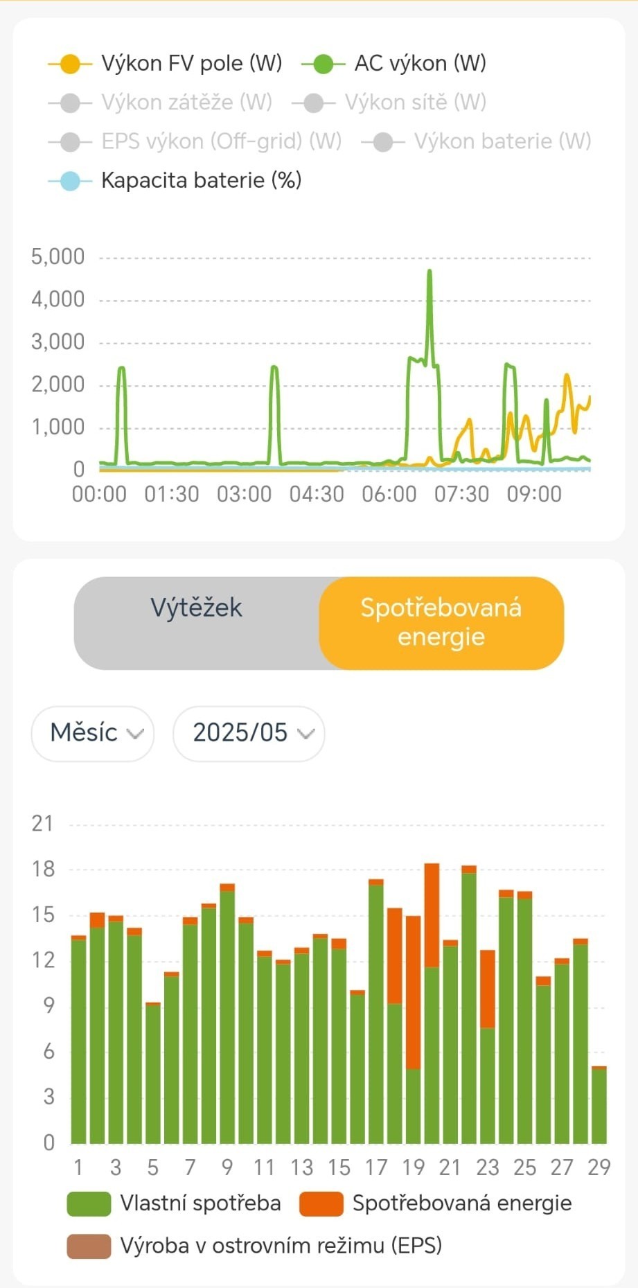 Majitelka domu zveřejnila screen z aplikace na FVE – na grafu lze vidět, že 18. 5. se příliš elektřiny nevyrobilo (s dodáním energie pomohl distributor sítě)