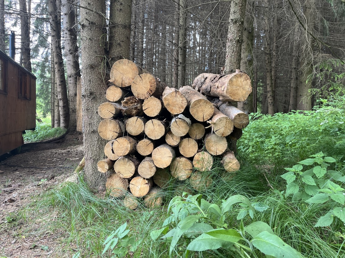 Dřevo na zimu si Filip ukládá mezi dva stromy, které nahrazují klasický dřevník