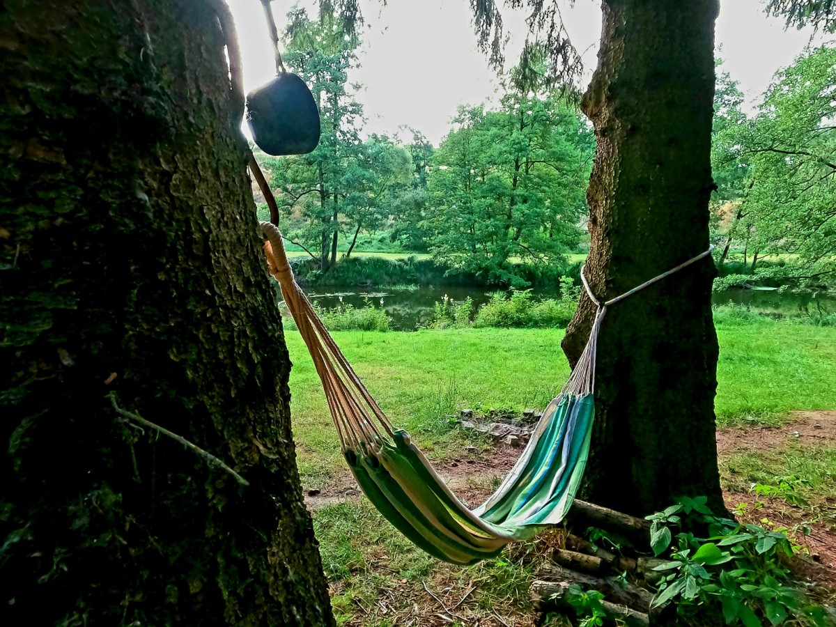 Pro trávení volného času si vedle maringotky Filip nainstaloval hamaku