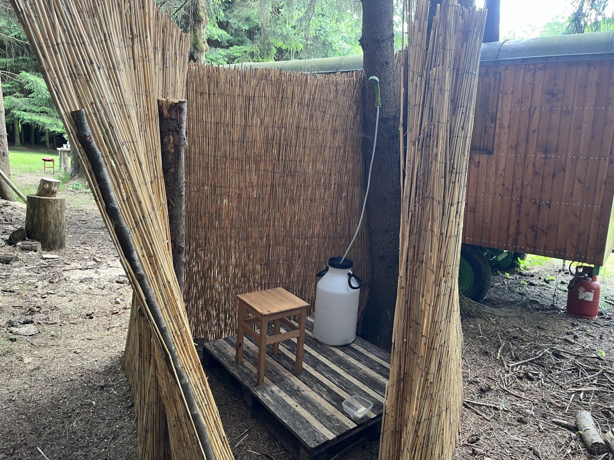 Jednoduše a účelně řešená venkovní sprcha s teplou vodou poháněná USB čerpadlem