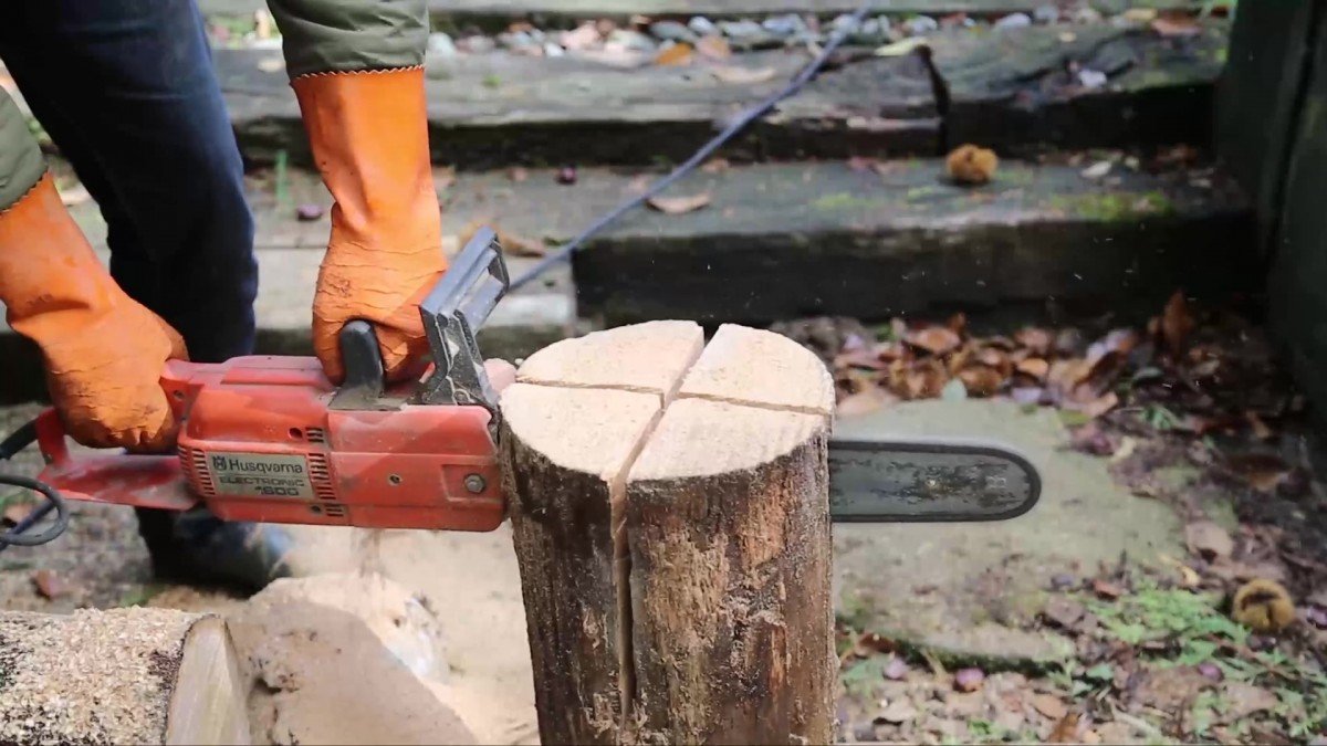 Motorovou pilou částečně nařízněte špalek do kříže