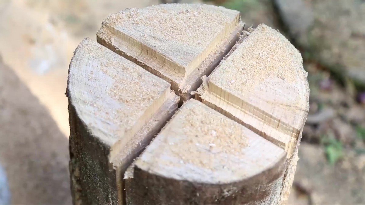 Detail dokonalého naříznutí. Dá se použít i sekera (popis níže)