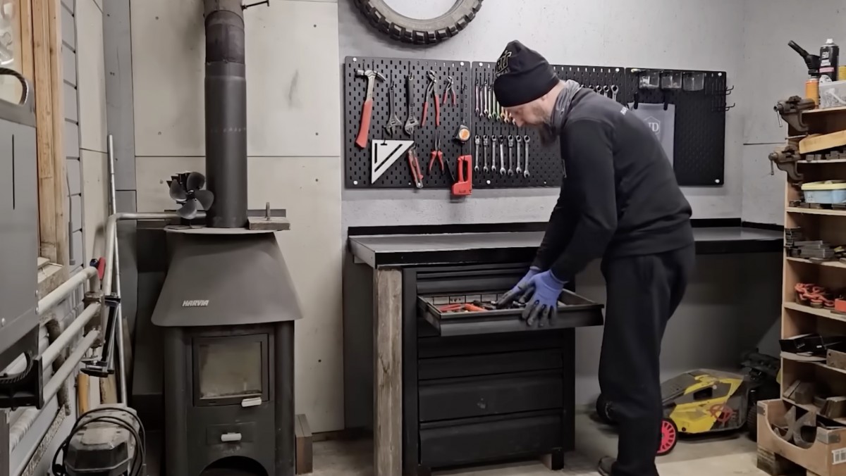 U pracovního stolu zasouvá zásuvku s nářadím do kovové skříňky a kontroluje její správné usazení
