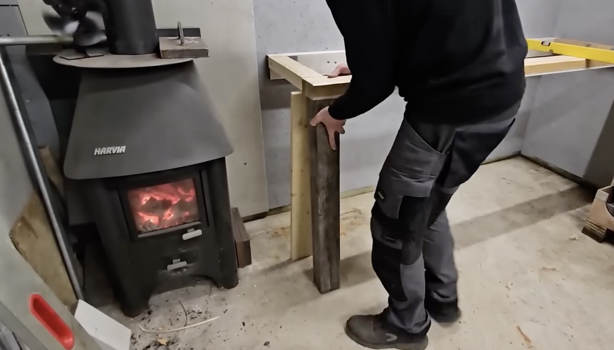 Vedle hořících kamen montuje nástěnný ponkový stůl z masivních hranolů a upevňuje jeho konstrukci ke stěně