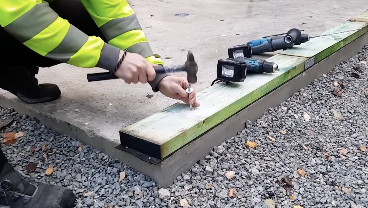 Hranoly byly k základové desce pevně ukotveny pomocí kotevních šroubů. Přesné osazení je zásadní pro rovinnost a následnou montáž paletových stěn