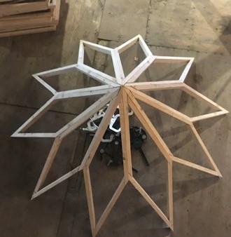 Dřevěné nosníky se v dílně spojují do panelů ve tvaru rovnoběžníku. Na fotografii je nachystaný vrchol skleníku