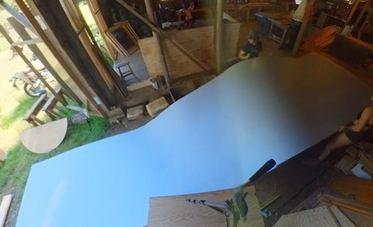 Velký pás polykarbonátu rozvinuli v dílně na pracovní ploše. Materiál tak mohli snadno obkreslit podle připravených dřevěných rámů panelů